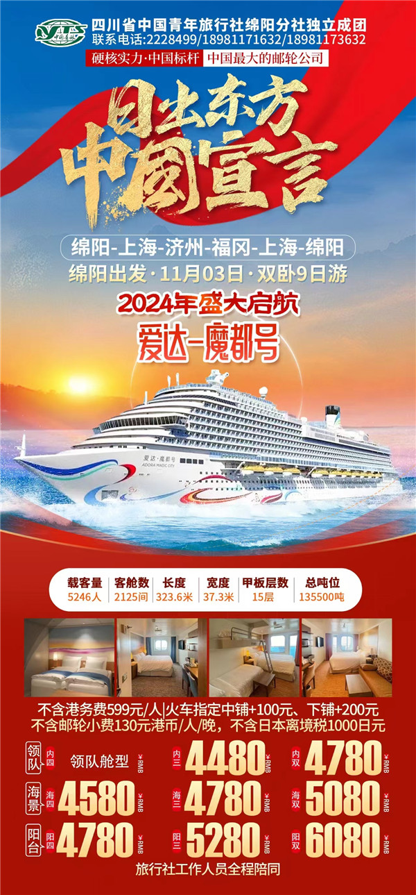 綿陽(yáng)中旅假日旅行社于2024年10月9日在市工會(huì)大廈成功舉行“愛(ài)達(dá)·魔都號(hào)豪華郵輪9日游”旅游線路推薦會(huì)。現(xiàn)場(chǎng)主持人向到場(chǎng)的嘉賓們?cè)敿?xì)的介紹了濟(jì)州、福岡等地的風(fēng)土人民、美食、美景以及出游的相關(guān)注意事項(xiàng)等內(nèi)容,受到了嘉賓們的熱烈歡迎和關(guān)注。服務(wù)熱線:0816-2228499/2238477 。